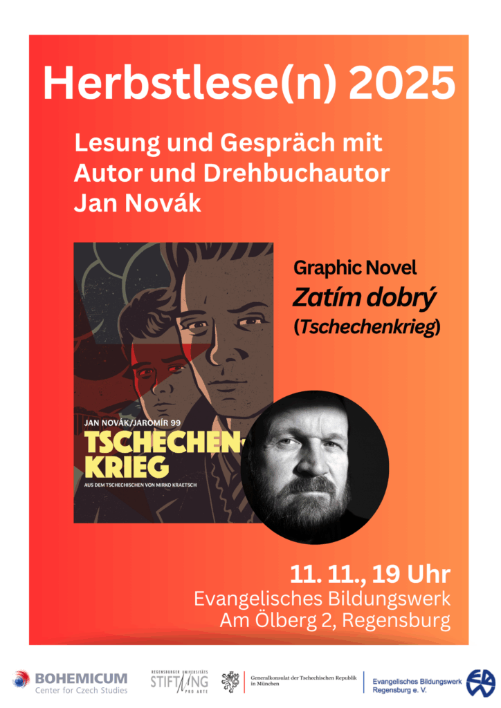 Herbstlese(n) 2025 ist eine Kooperation des Bohemicum – Center for Czech Studies der Universität Regensburg mit dem Evangelischen Bildungswerk Regensburg und wird gefördert von der Regensburger Universitätsstiftung PRO ARTE und dem Tschechischen Generalkonsulat in München.