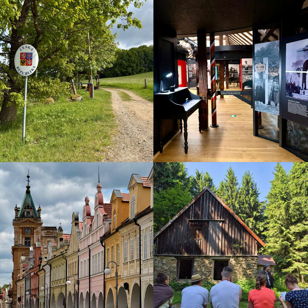Im Mai und Juni begab sich das Seminar auf zwei Exkursionen – eine zweitägige rund um Újezd, Domažlice, Lučina und Furth im Wald und eine eintägige nach Schönsee, Bügellohe und Pleš. An verschiedenen Stationen gingen die Studierenden der Frage nach, auf welche Weise die bayerisch-tschechische Grenze vor Ort sowohl historisch als auch gegenwärtig verhandelt, ausgestellt, (re-)präsentiert und wahrgenommen wird. Sie beschäftigen sich mit Vermittlungsmedien und -institutionen – von Kulturzentren und Ausstellungen über Infotafeln, Denkmäler und Skulpturen bis hin zum Festspiel oder einer szenischen Lesung. Dabei kamen sie auch mit vielfältigen lokalen Akteur*innen ins Gespräch. Die Seminargruppe kam durch die Erkundungen vor Ort mit einer große Bandbreite an grenzbezogenen Themen in Berührung: mit „verschwundenen“ Dörfern; mit den Erwartungen, die mit dem Fall des „Eisernen Vorhangs“ verknüpft wurden; mit der nationalen Relevanz der Chodsko-Region in Tschechien; mit dem Verhältnis von Natur, Grenze und Tourismus; mit musikalischen Traditionen in Bayern und Böhmen usw.